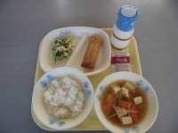 10月10日(金) ご飯、牛乳、かつおのあけぼの和え、キャベツのなめたけ和え、秋の香り汁