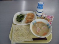 3月3日(火) 中華めん、牛乳、とん骨ラーメン(汁)、揚げギョーザ・3個、チンゲンサイのナムル、ひなあられ