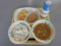2月27日(金) 麦ご飯、牛乳、ボロニアカツ、ポテトサラダ、コンソメスープ、野菜ふりかけ