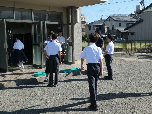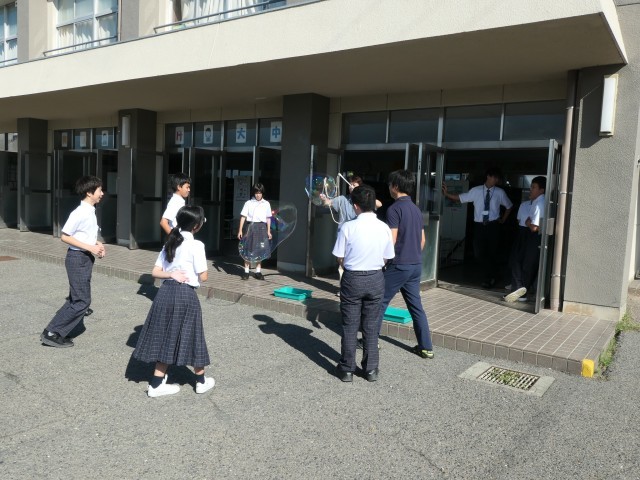 今日の理科の時間は大きなシャボン玉づくりを行っていました。2種類のシャボン玉液を作って試していました。