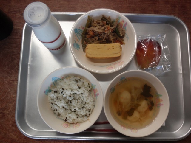 今日の献立は、ごはん、牛乳、厚焼き卵、ごぼうの甘辛炒め、えびしんじょうの吸い物、りんごでした。