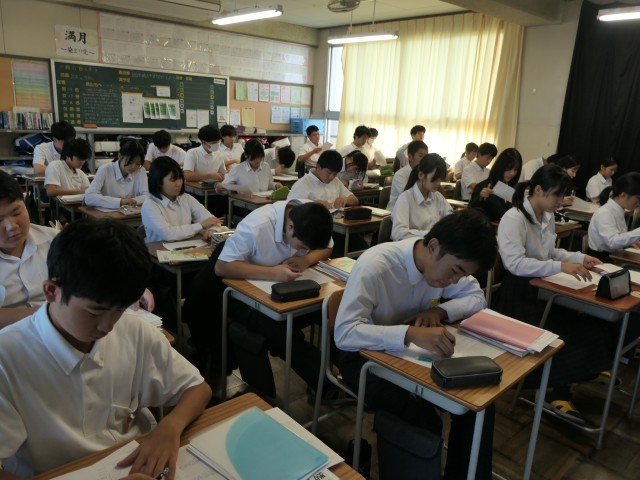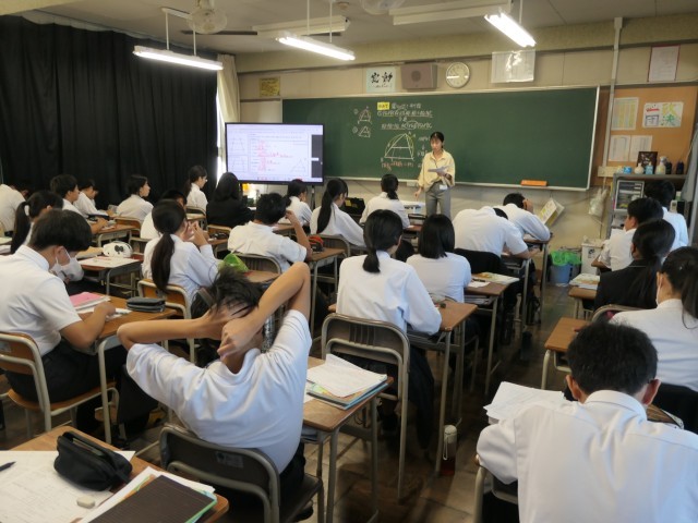 今日の数学の時間は、線分の比と平行線の練習問題に取り組んでいました。いろいろなパターンの問題に取り組んで、力をつけていました。