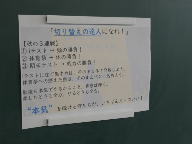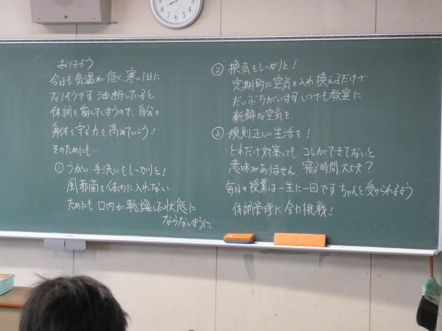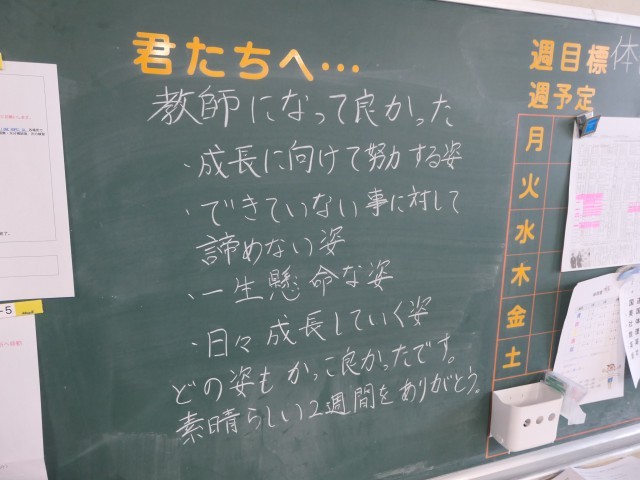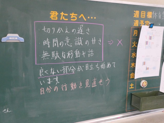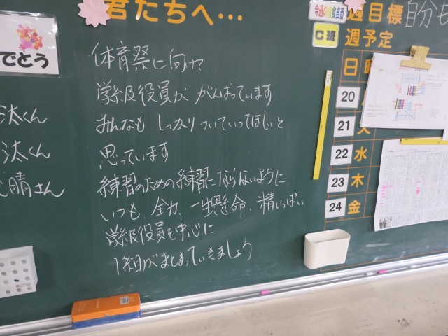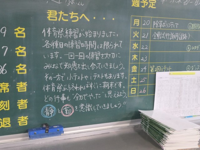 今朝も教室を回ってみると背面黒板等に先生方からのメッセージが書かれていました。一つのことをしばらく残している先生もいれば、毎日書き換えている先生もいます。これらの言葉はすべて、大中生への担任の先生方からのメッセージです。黒板に書かれた言葉は消えていきますが、言葉の意味やそれに込められた思いは、心に残していってほしいと思います。