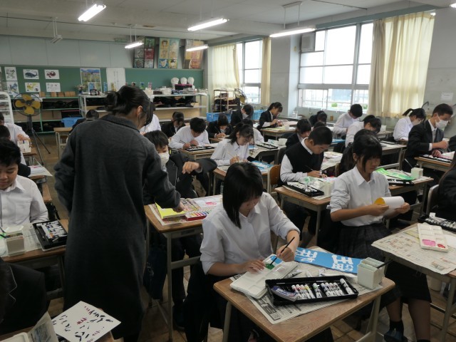 今日の美術の時間は、名前デザインの作品を完成させていました。ポスターカラーできれいに彩色をしていました。