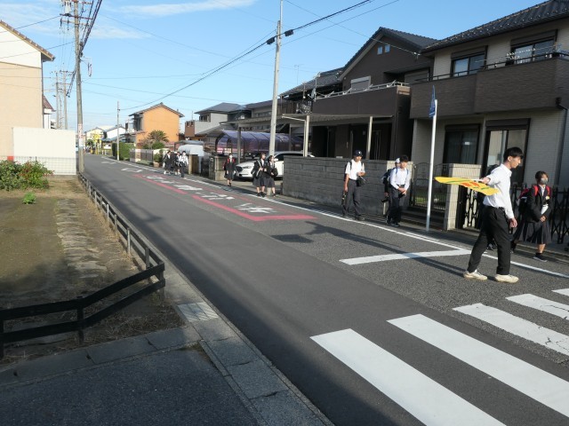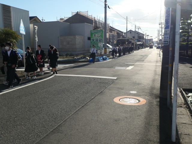 最近、朝や帰りに学校の北側の道で送迎の車の乗り降りをする姿を目にします。この道は、通行量も多く、たくさんの生徒が登下校で通る道になっています。この道での車の乗り降りはご遠慮いただきたいと思います。また、学校のすぐ北側の三角地は学校の敷地ではありませんので、ここに車を止めることもご遠慮いただきたいと思います。ご理解とご協力をお願いいたします。