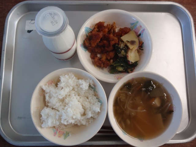 今日の献立は、ごはん、牛乳、ヤンニョムチキン、まごわやさしいナムル、ワンタンスープでした。