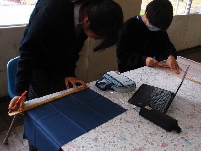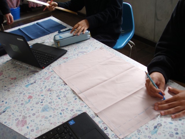2年生の通室生徒は、家庭科教員の担当する時間にミニトートバッグ作りを始めました。まずは、しるし付けです。クロームブックのスライドに示されている手順を確認しながら、手際よく進めることができました。