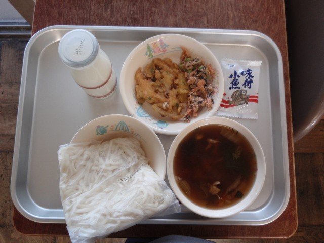 11月7日の給食は、五目うどん、野菜のかき揚げ、ひじきのごまマヨ風味和え、小魚でした。