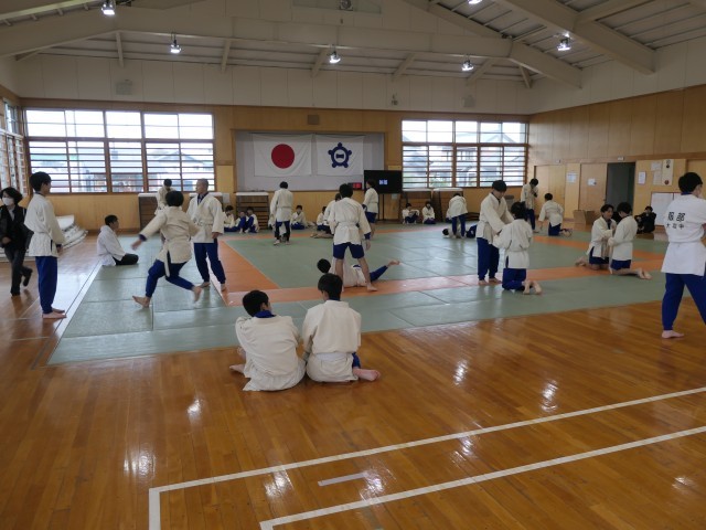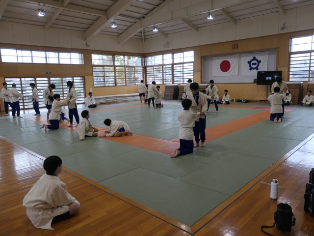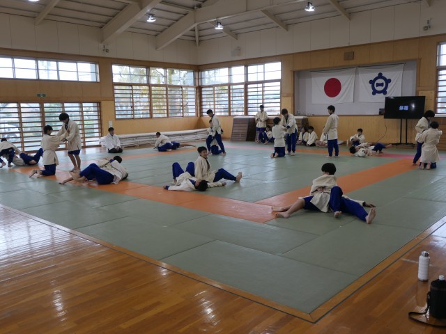 2年生の体育の時間は、柔道の練習をしていました。低い位置からの投げの練習と抑え込みの練習をしていました。