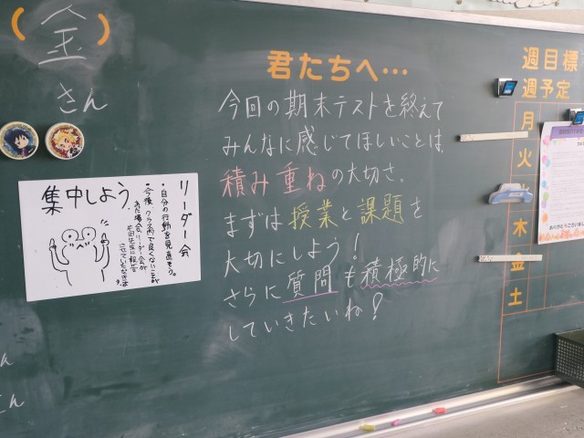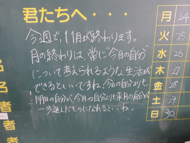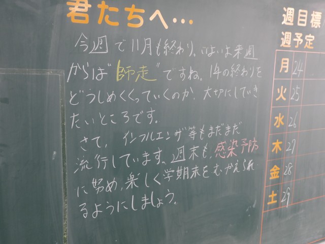 教室の背面黒板を見てみると、担任の先生からの師走に向けた言葉や生活を再度見直すための励ましの言葉が多く書かれていました。大中生の皆さん、残りあとひと月です。2025年を振り返り、足りなかったこと、やり残したことに全力でチャレンジをしてほしいと思っています。