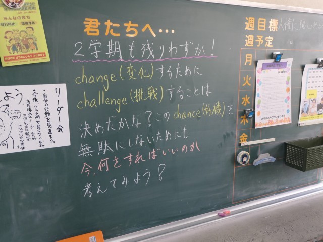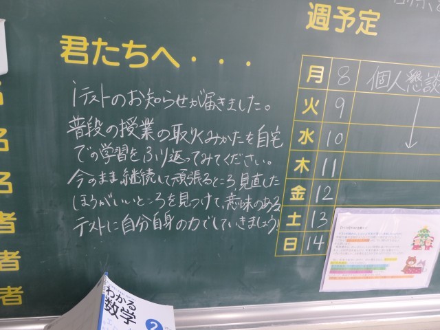 2025年も残すところあとわずかになりました。教室の先生方のメッセージも年の瀬や次の目標に向けてのメッセージが書かれていました。2学期の締めくくりをして、次につなげる時ですね。
