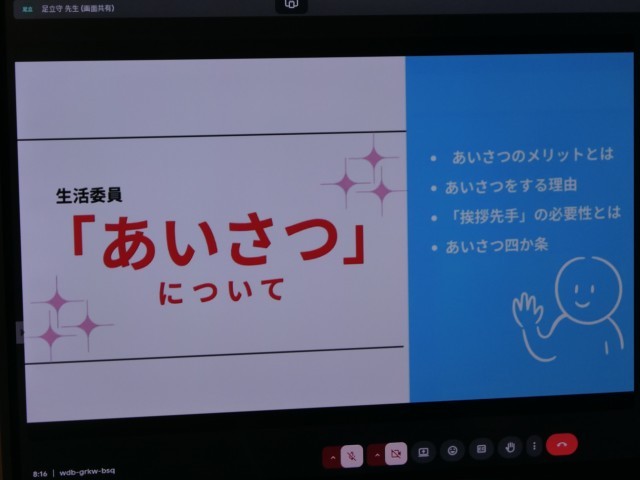 今朝は、リモート朝礼を行いました。生活委員会からは、「あいさつの意味」と「さよならあいさつ運動」についてのお話がありました。「さよならあいさつ運動」は、12月22日に予定しています。皆さんで気持ちの良いあいさつの響く学校にしていってください。