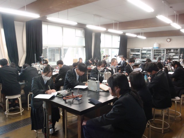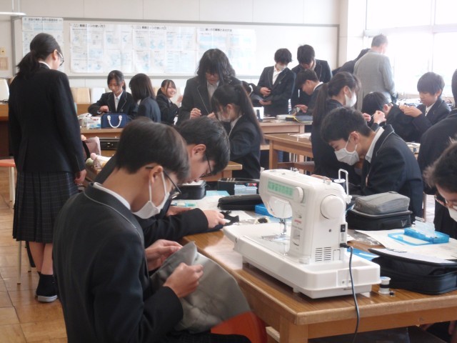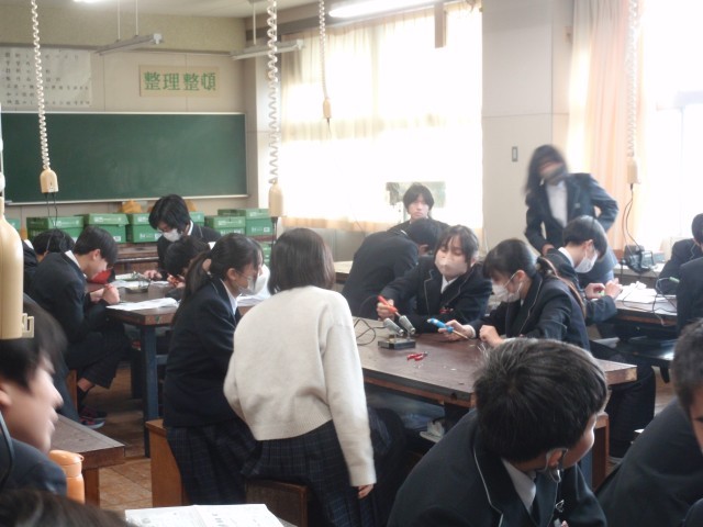 1組の理科は「電気抵抗」、2組の英語は「ALTの先生と話そう」、3組の家庭科は「トートバッグ作成」、4組の技術は「ポケットライト電子部品のはんだ付け」、5組の国語は「走れメロス」について、各クラス学習したり、作業を進めたりしていました。
