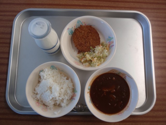今日の献立は、愛知のハヤシシチュー、愛知の野菜コロッケ、いろどりサラダでした。