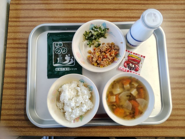 2/3(火)の献立は、まぐろの甘辛煮、即席和え、のり、吉野汁、煎り大豆でした。