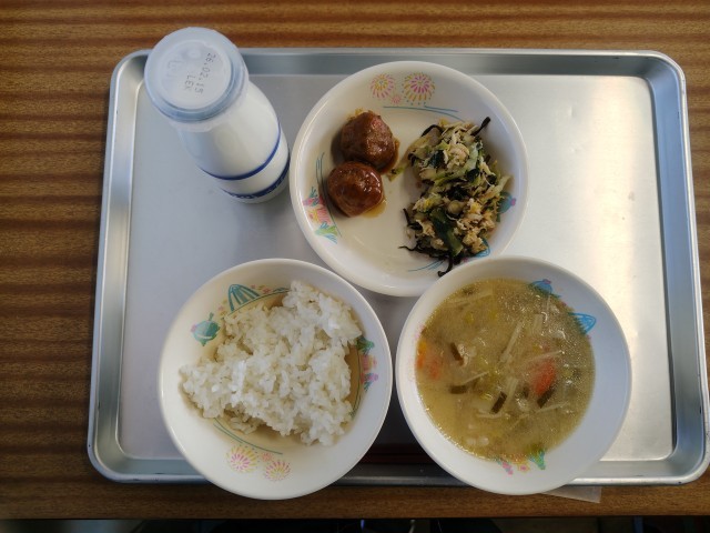 2/4(水)の献立は、肉団子、白菜の昆布和え、かす汁でした。