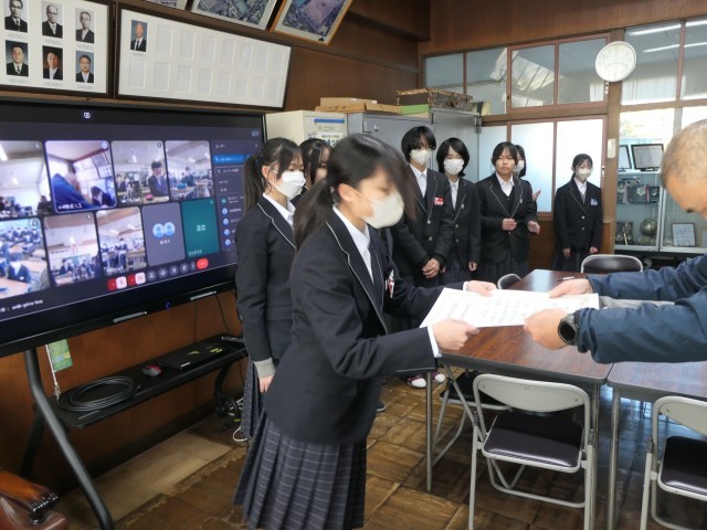 それに引き続いて生徒指導主事から交通事故に気を付けること、SNSの使い方や正しい情報・間違った情報を見分けることについて指導がありました。大中生の皆さんが自分の命を大切にして、楽しく学校に登校してくれることを願っています。