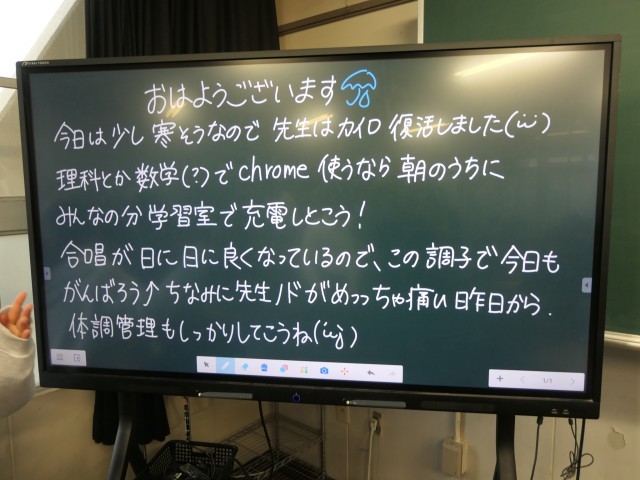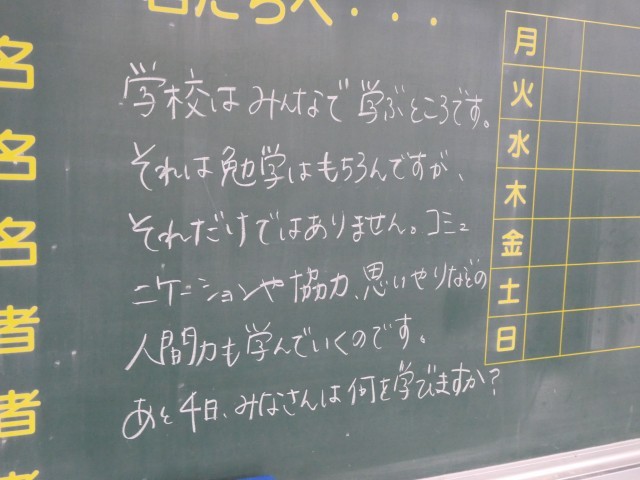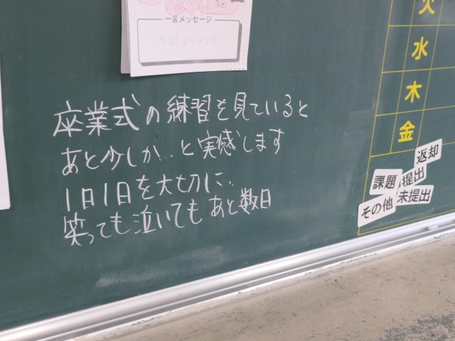 今朝、各教室を回っていると、3年生の教室の背面黒板に担任の先生からのメッセージが書かれているのを見ました。卒業式まであと4日です。3年生の皆さんには、胸を張って卒業式が迎えられるように、先輩としての行動を期待しています。