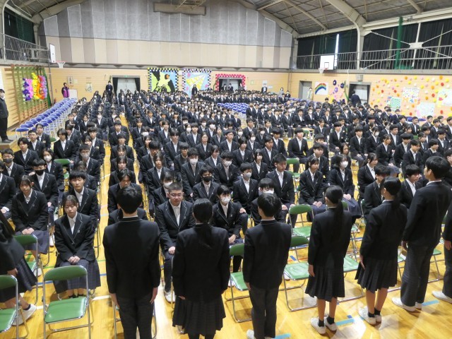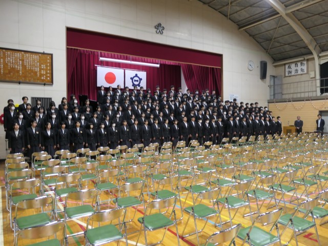 まず最初に、卒業式の予行練習を行いました。1年生は明日の式には出ないのですが、全校生徒が参加をして、予行を行いました。