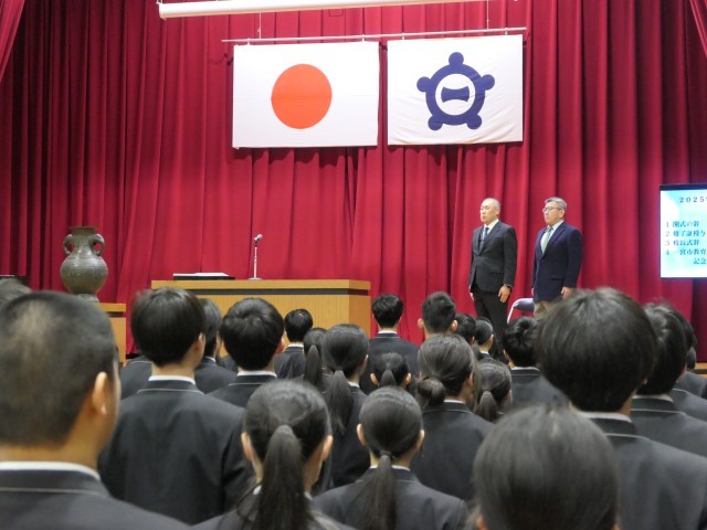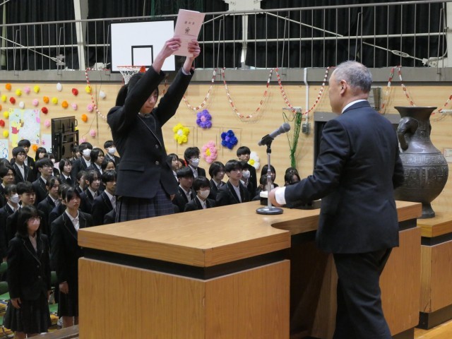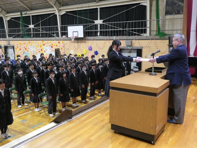 その後、PTA会長様に来校していただき、3年生修了式と卒業記念品授与式を行いました。3年生代表に修了証、一宮市教育委員会からの卒業記念品、大和中学校PTAからの卒業記念品を授与しました。代表生徒は立派な態度で受け取っていました。