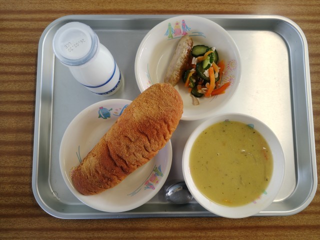 今日の献立は、きなこ揚げパン、焼きフランクフルト、いろどりサラダ、コーンクリームスープでした。