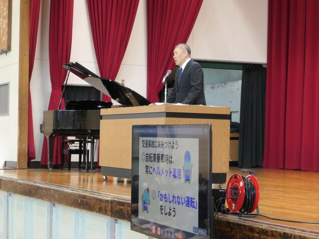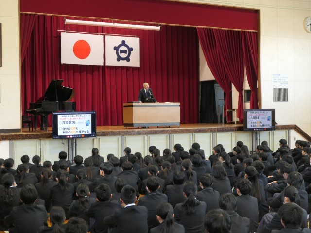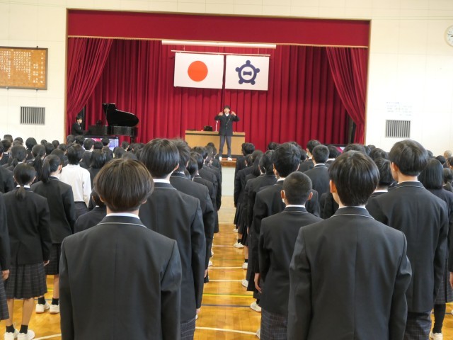 続いての校長式辞では、まずは、大中生の皆さんに今年度を通して話をしてきた「凡事徹底」と「自分の笑顔も友達の笑顔も輝かせる」ことについての自己評価をしてもらいました。その後で、「『春休み中に大和中学校をどんな学校にしていきたいか・大和中学校の伝統とは何か』を考えてほしい」というということを伝えました。大中生の皆さんには、1年間の反省と来年度のスタートに向けて、この春休みを有意義に使ってほしいと思います。
