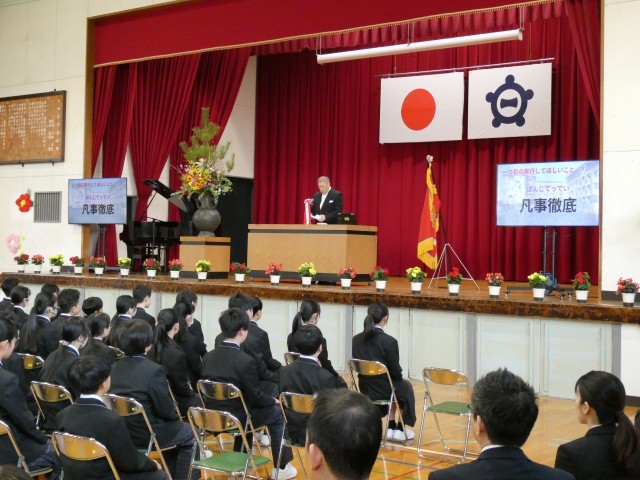 一つ目は「凡事徹底」です。 これは、中学校生活において当たり前のことを徹底して実践することを意味します。 大和中学校での「当たり前」とは、「時を守り・場を清め・礼を正す」の三つです。 義務教育を終え、次のステップへ進むための基礎を作るためにも、これらを常に心がけてください。 平凡なことを非凡なまでに続けることは心の成長に繋がり、まさに「継続は力」となります。 伝統であるこの姿勢を自ら実践し、人としての成長を遂げていくことを期待しています。