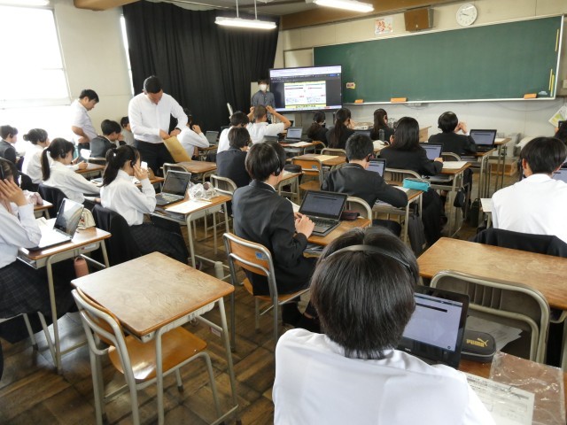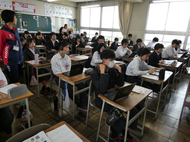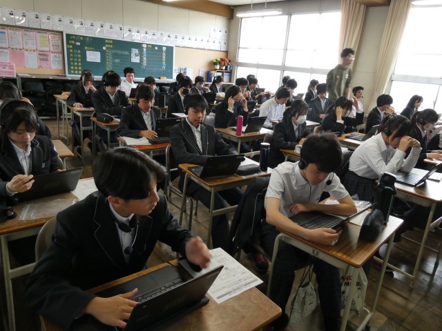 今日は、英語の全国学力学習状況調査を実施しました。タブレットにヘッドセットをつけて、聞き取り問題も実施しました。3年生の生徒は真剣にテストに取り組んでいました。