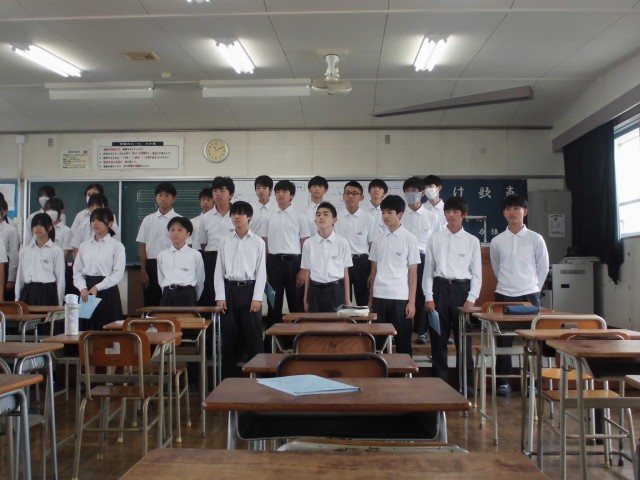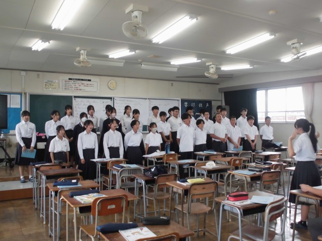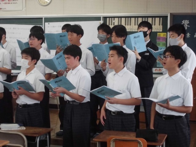 音楽の授業では、合唱コンクールの課題曲に取り組んでいます。楽譜にある音符・休符に従って、音程や拍をそろえる練習を繰り返し行いました。