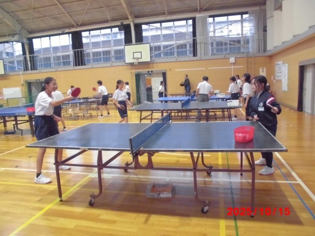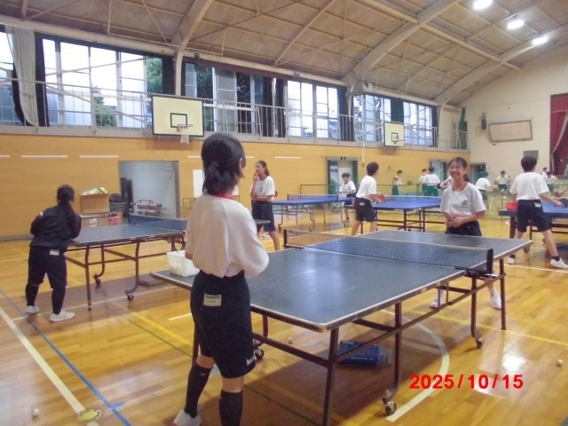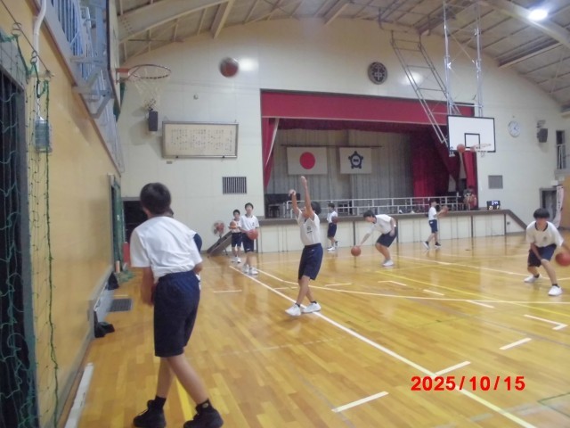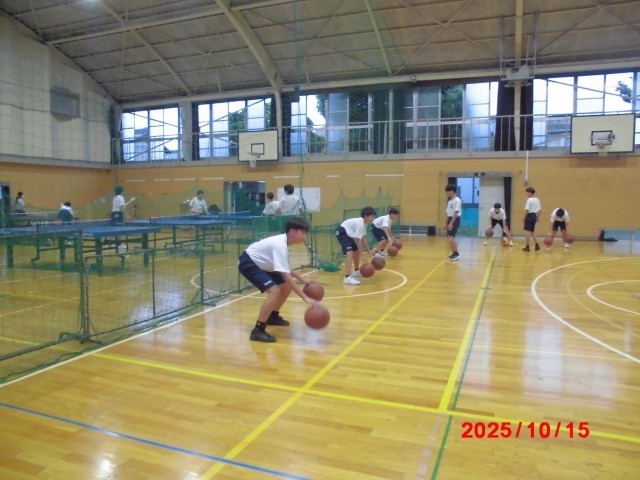 卓球部と男子バスケ部の様子です。バスケ部では、限られたスペースの中でシュート練習をしたり、ドリブル練習をしたりしていました。