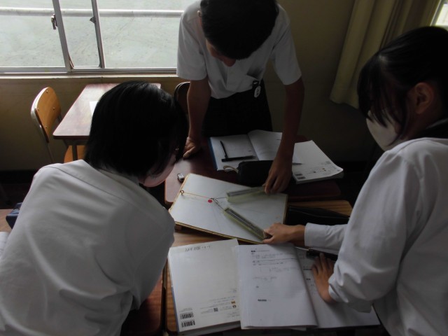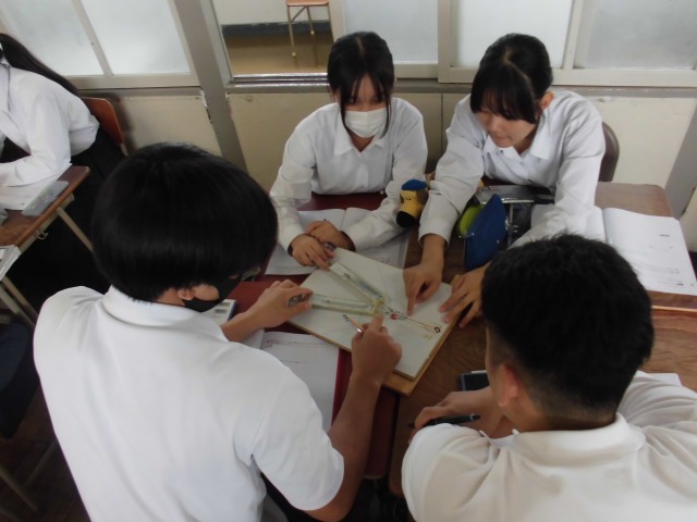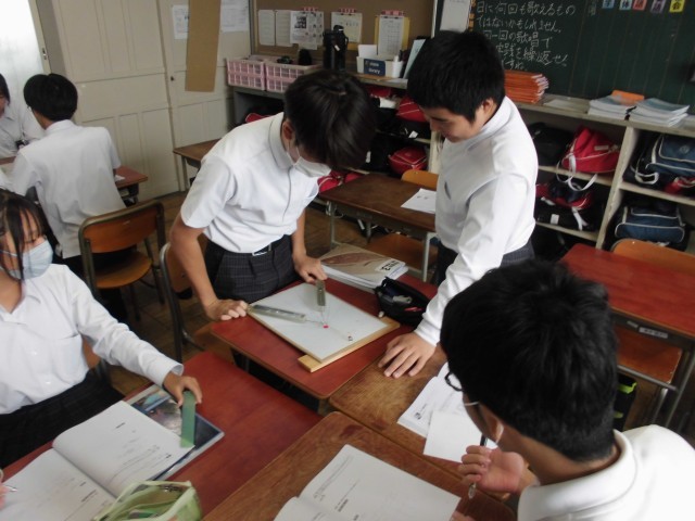 理科の授業では、力の合成について学習しました。ばねばかりを2本使い、その角度によって合力の大きさがどのようになるかを調べました。