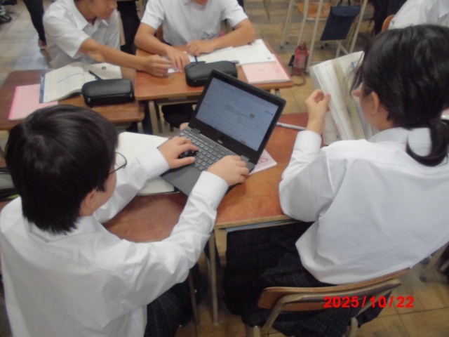 今日の授業の様子です。クロームブックを活用して、自主的に学びに取り組む姿勢が見られました。合唱コンクールの練習にも一生懸命ですが、日々の学習も前向きに取り組む姿勢は大切です!