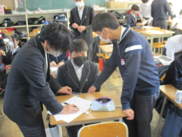 10月30日 授業の様子(3年生) 公開日 2025/10/30 更新日 2025/10/30 3年生 理科では、「仕事とエネルギー」の学習をしています。「合力」「分力」の練習問題を、近くに座っている生徒と相談しながら考えました。