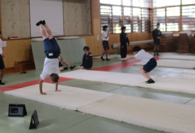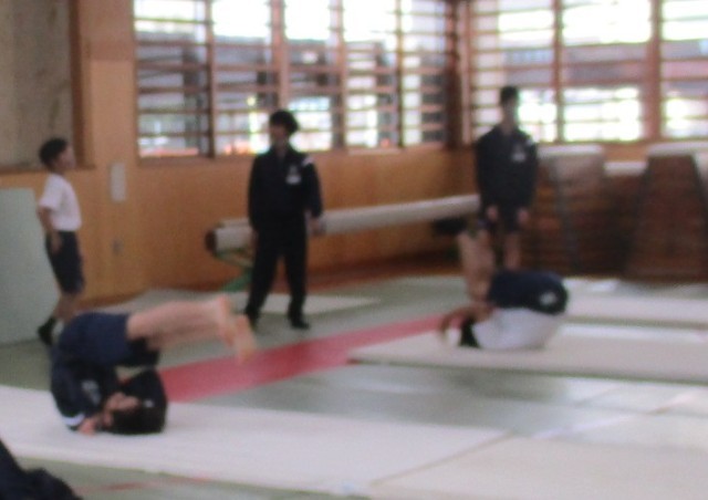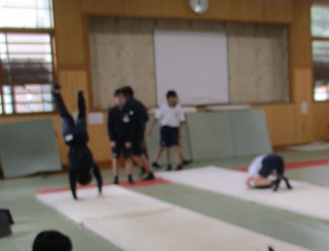 倒立前転、開脚前転、後転などさまざまな技の練習をしていました。