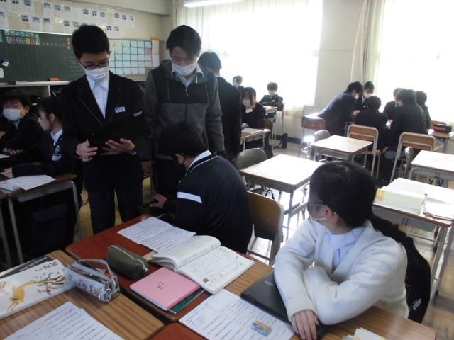 国語では、仁和寺にある法師についてスライドにまとめるグループ活動をしました。英語では、ALTの先生とアクティビティを行い、グループごとに英語で話し合い、お題にそった表現を行いました。級友と協力し合い、学習に取り組む姿がとても素敵です。