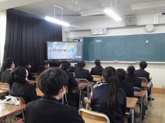 6時間目のオンライン集会の様子です。生徒会執行部が中心となって、3年生を送る会に向けての説明を行いました。3年生に感謝の気持ちを届けることができるよう、これから準備を進めていきます。