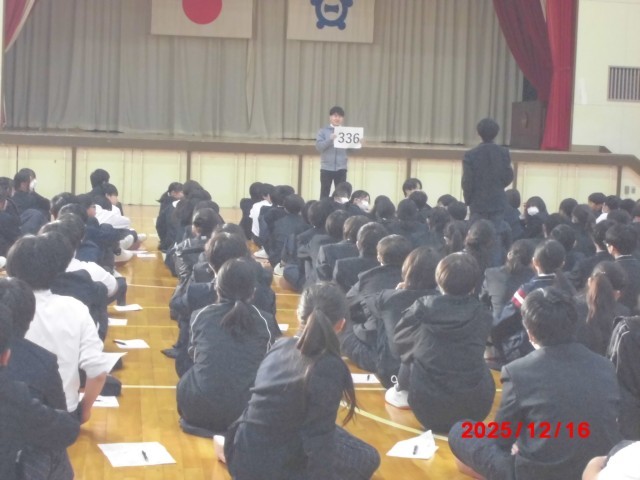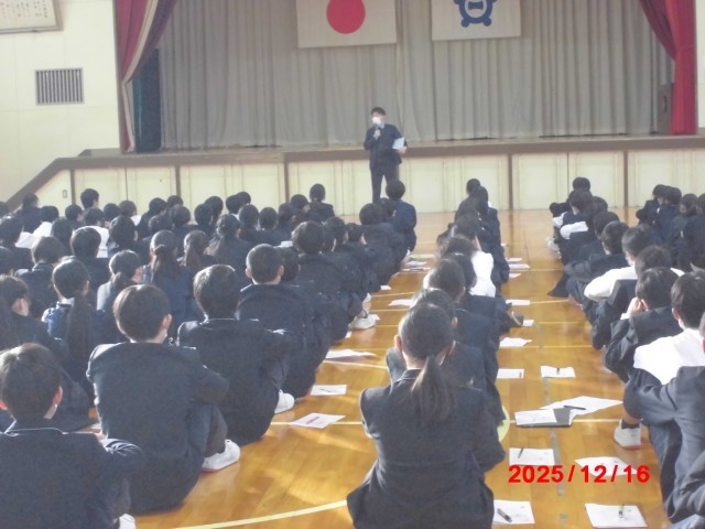 1年生は6時間目に学年集会を行いました。冬休みの過ごし方や3学期に向けての話が各先生からありました。いくつかの数字が出てきて、みんなで何の数字かを予想しました。今日の話を受けて、14日間の冬休みをどのように過ごすか目標を立てて、良い3学期のスタートをきってほしいなと思います。
