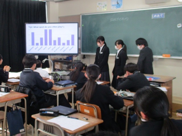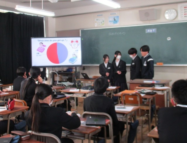 英語では、好きなスポーツや寝る前に何をするかなど、クラスメイトに調査した内容をスライドにまとめました。