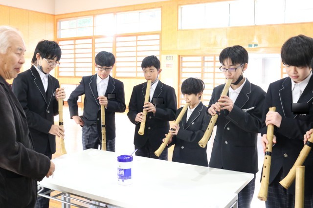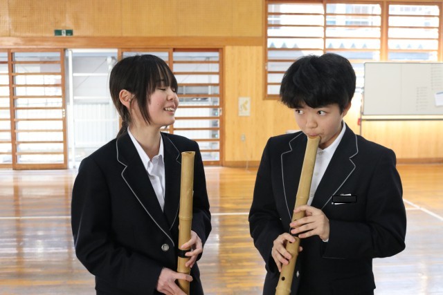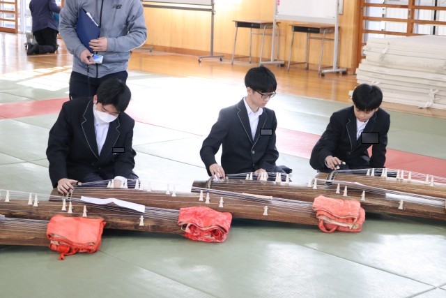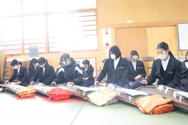 日本の楽器である「箏」と「尺八」を実際に演奏します。今日は、3組と4組の生徒でした。