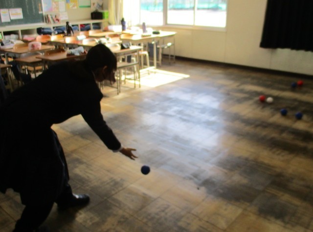青チームと赤チームに分かれ、6球ずつ交互にボールを転がします。