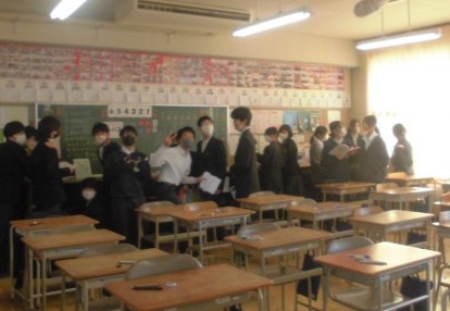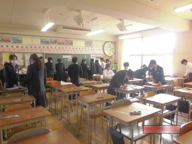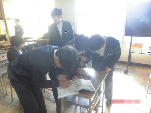 総合テスト2日目の数学が終わった直後の様子です。次の保健体育に向けて、放課中に最終確認をしているようです。1年間のまとめのテスト、全力が出せるように頑張ってください。