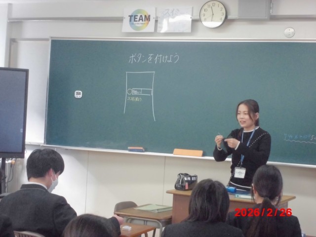 家庭科の時間では、ボタン付けを行いました。生徒同士でやり方を確認しながら、教え合う姿がありました。