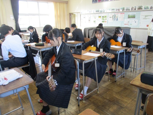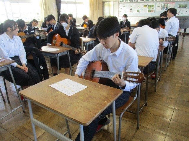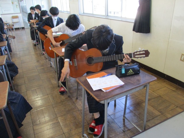 音楽の最後の授業では、ギターの演奏に挑戦!