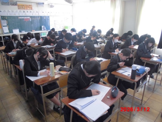 本日3時間目の授業の様子です。2年生に向けて、各教科まとめの活動をしていました。グループでミッションに取り組んだり、入試問題にチャレンジしたり、真剣に取り組む様子がたくさん見られました。来年度に向けてしっかりと力をつけていきましょう!