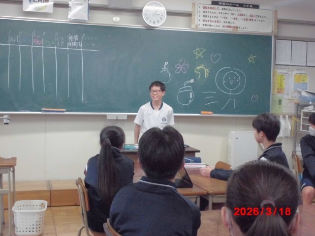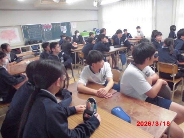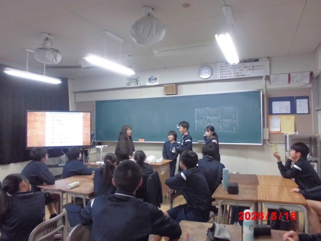 本日の学級レクリエーションの様子です。外で学年レクリエーションの大繩をする予定でしたが、雨のため教室でのレクリエーションとなりました。言葉だけで感情や状況を説明するゲームで、クラスからは笑い声があふれ、生徒たちの楽しそうな表情を見ることができました。今のクラスも残りわずかです。仲間と過ごす時間を大切にしていきましょう。