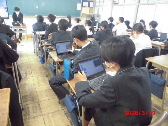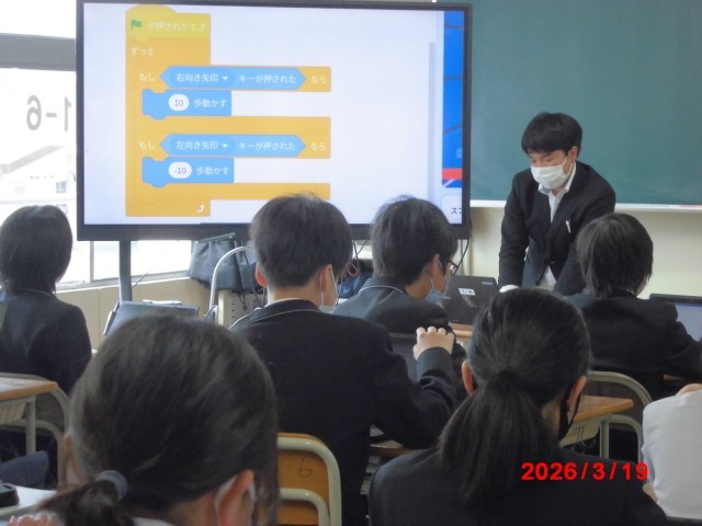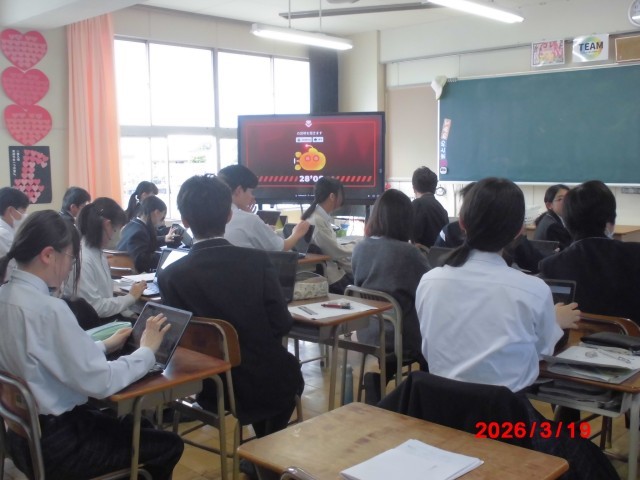 1年生の技術ではプログラミングのスクラッチを学習していました。「小学校でやったー」とか「懐かしい!」という声が聞こえていました。7組の社会ではタブレットを使って「都道府県や地図記号のクイズ」をしました。全員参加の早押しゲームになっていて、途中で仲間で助け合うステージがあり、盛り上がっていました。