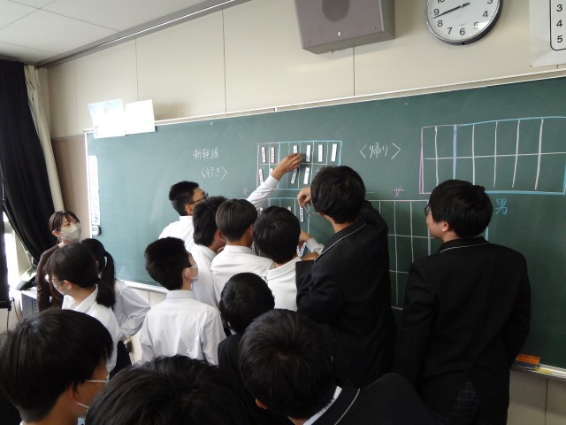 1時間目の様子です。修学旅行の部屋割りや新幹線の座席決めを行いました。準備の段階からみんなで協力して進める姿がたくさん見られます。