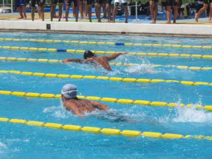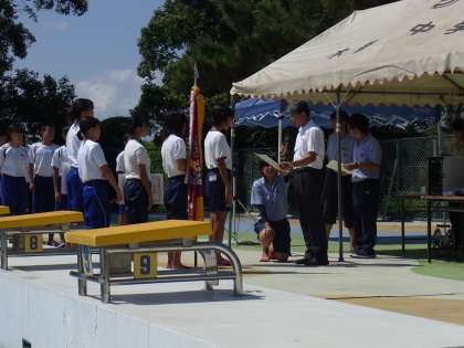 本日快晴の中、水泳部の新人大会が行われました。1・2年生で出場する初めての大会です。それぞれが目標を立て、それに向かって一生懸命泳ぎました。その結果ほとんどの選手が自己ベストを更新でき,夏休みの練習の成果が表れていました。女子は総合で3位、男子も女子も個人種目やリレーでそれぞれ入賞することができました。この調子で9月に行われる大会も頑張ります!
