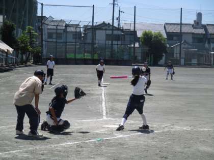 夏休みも終盤になりました。中学校では、部活動に励んでいる生徒たちが多くみられます。運動場では、ソフトボール部が、西成中学校と練習試合をしていました。顧問の先生からアドバイスを受け、精一杯プレーに励んでいました。3年生も応援に駆けつけ、温かくプレーを見守り、後輩たちにアドバイスをしていました。