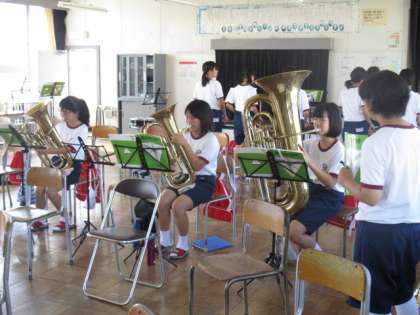 体育館では、バスケットボール部男子が、顧問の先生からの指導後に、攻撃側と守備側に分かれて、1対1でボールを奪い合っていました。プレーのコツをつかもうと、どの生徒も必死になって練習に取り組む姿が印象的でした。南館では、ブラスバンド部がパートに分かれて、熱心に練習に励んでいました。パートのリーダーがアドバイスし、パートごとに完成度を高めようと何度も練習を繰り返していました。